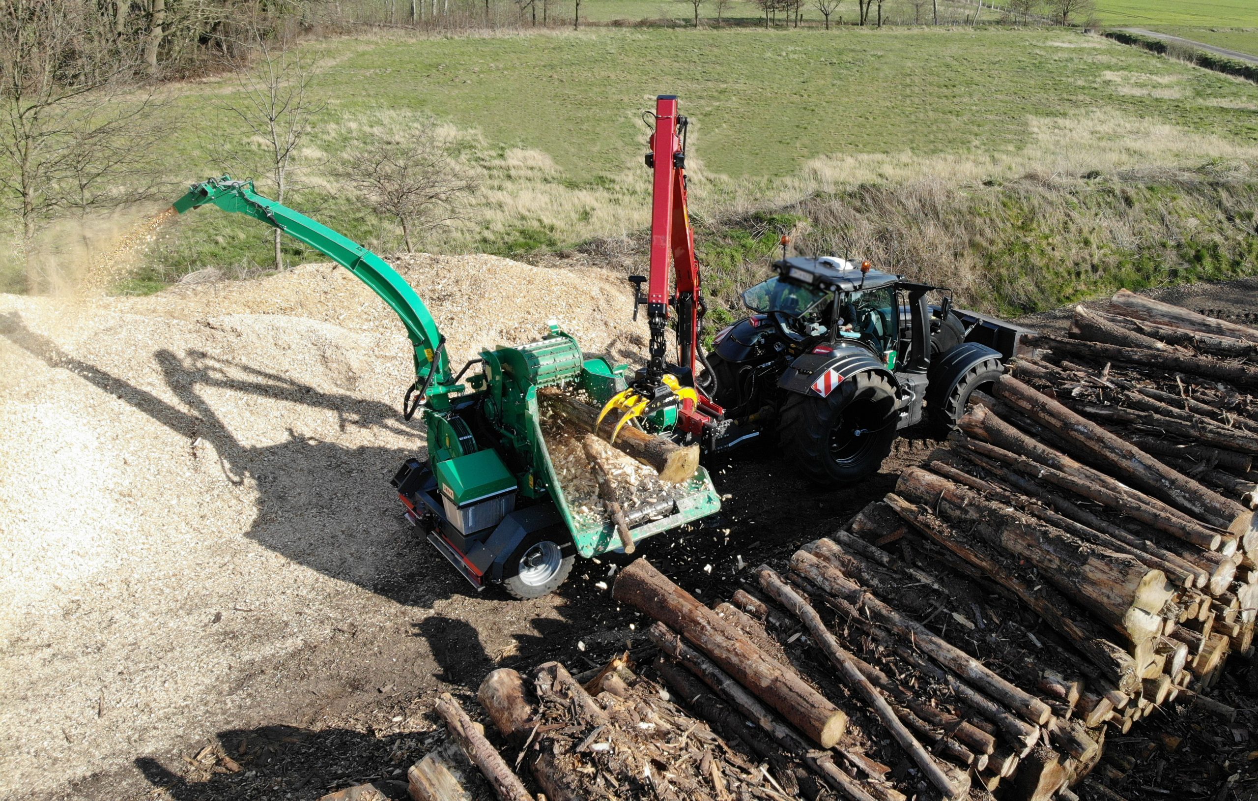 Svært vanlig løsning sammen med traktor som har motor fra 150 til 500 hk. Flishuggeren driftes via traktorens kraftoverføringsaksel. Kran som oftest montert på flishuggeren og driftes via traktorens hydraulikk. Vendbart førersete i traktorens hytte er en forutsetning for å ha et komfortabelt arbeidsmiljø