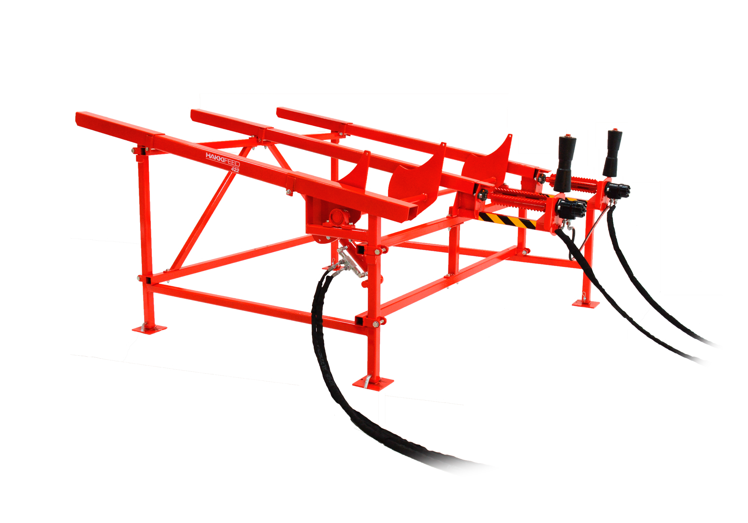 Det hydrauliske stokkabordet HakkiFeed 422 gjor matingen til en lettvint prosess. Innmatingsvalsene ruller sammen med vedmaskinens innmaterbånd. HakkiFeed 422 stokkstativ kan kobles til modellene 38, 43 og 50 så vel som Falcon- og Raven-modellene med et ekstra ventil- og et tilkoblingssett.