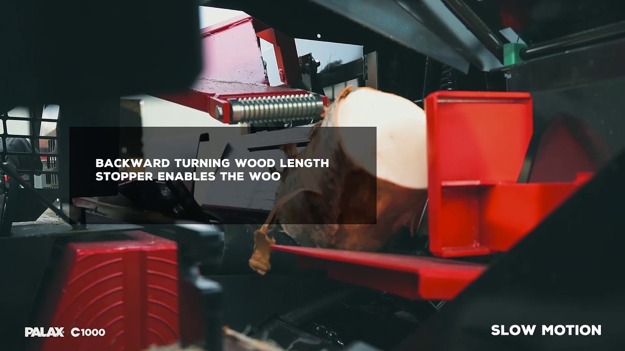 Den nye, mer ergonomiske designet til Palax C1000-maskinen gjør den enklere og mer effektiv i bruk. Maskinens sikkerhetsnett har også blitt redesignet, noe som har betydelig forbedret sikten til kløyvekanalen. Et patentert Palax Optimi-System kontrollerer vedkløyvingslengden. Sammen med en automatisk hurtigbevegelsesventil gjør dette kløyvingen av tømmerstokken raskere enn noen gang, uten å glemme det raske kuttetempoet til sirkelsagen. Det 1000mm skjærebladet i hardmetall kapper raskt, rent og vedlikeholdsfritt. Palax C1000 styres enkelt og presist med joystick. I tillegg er maskinen utstyrt med automatisk kilereimstramming, noe som radikalt øker levetiden til både kilereimene og hele kraftoverføringen.